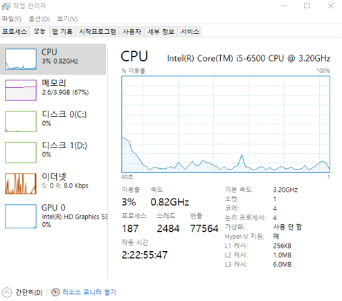 작업 관리자를 열어보면 CPU의 구체적인 정보를 알 수 있습니다.