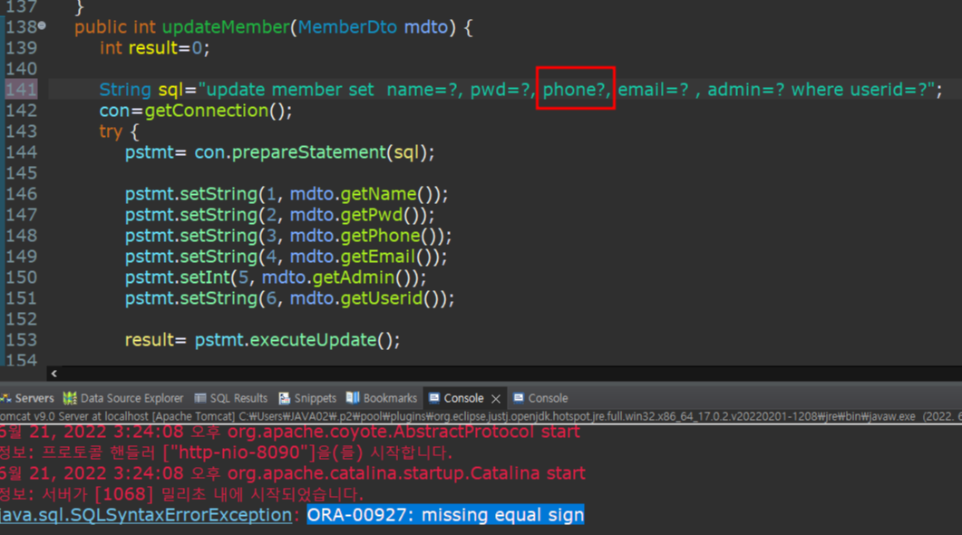 에러 내역 그대로 equal 등호가 없어서 나타난 오류다. sql문 작성 시 오타가 있는지 항상 확인해보자.